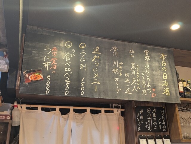 横浜、土曜日、15時半。【おまかせコース】飲み放題込!旬の食材と雲丹をつかった少量多皿◎少量多皿15品おまかせコース。やっと予約できた。ホントに、少しずつたくさん色々な種類の料理を出してくれる。先付のあとは福井県産の炙りさわら、勝浦のかつお、あつあつの肉焼売、沖縄県糸もずく、浜名湖の海苔がのってる茶碗蒸し、エビの春巻き いぶりがっこのタルタル、みかん巻き、こぼれ雲丹トロ、キラキラいくらと雲丹の狂宴は幸せの味だった。最後の雲丹ボナーラまで堪能して10,000円。プリン体万歳!いっぱい食べて飲む方には、かなりコスパ良し。