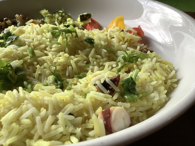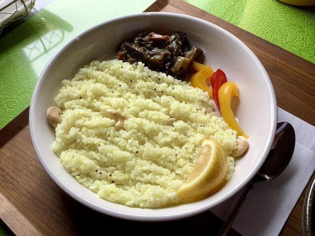 小エビのプラオライス(空芯菜のバター炒め、ナスのチェティナード炒め付き)
