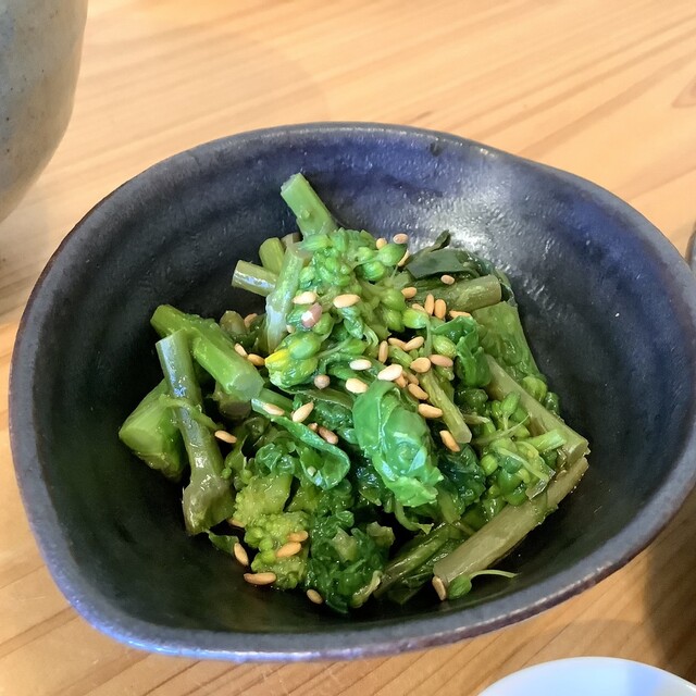 筍の木の芽和え(右下)、自家製ピクルス(左中央)、グリーンサラダ