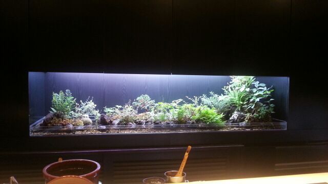 カウンター席だったのですが、漆黒の壁と白木のカウンター、正面には照明に照らされた箱庭のようなハイドロカルチャー植物があって雰囲気抜群ですよ。