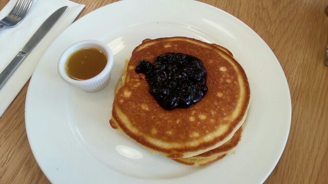 こちらのパンケーキ、一見普通に見えるんですがバランスが良くて私は好きなんですよね^^ 酸味の効いたブルーベリーが大人の味です。私は後半に少しだけメイプルバターをかけるんですがコクが出てこれもイケます^^