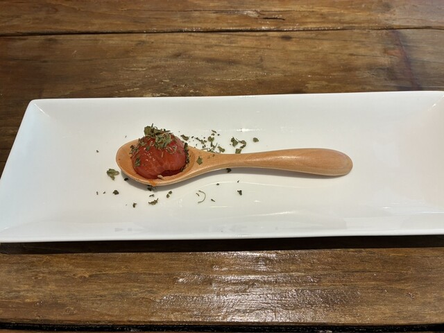いつも同じなのかは分からないが、今日は、スプーンにのせられたミニトマト、その上に散りばめられた乾燥ハーブ、ん〜、思い出せないけど、知っているやつ、ん〜、ん〜。