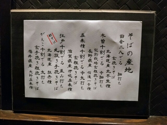 田舎ニハざるは北海道産北早生種の細打ち玄挽き蕎麦。香り・喉越しが良く、塩あるいは何もつけずに食べても美味しいが、本格派の辛汁や山葵などの薬味も良い感じ。