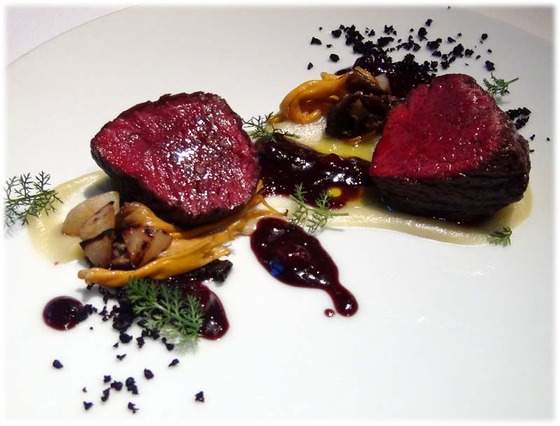 5.北海道白糟町から頂いた蝦夷鹿ロース肉のロティ、無花果と赤ワインのソース菊芋のピュレ、シャントレル茸とのこぎり草