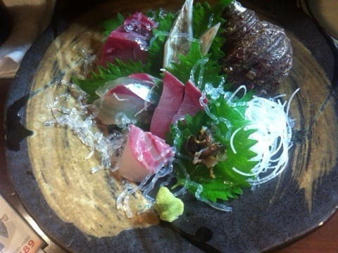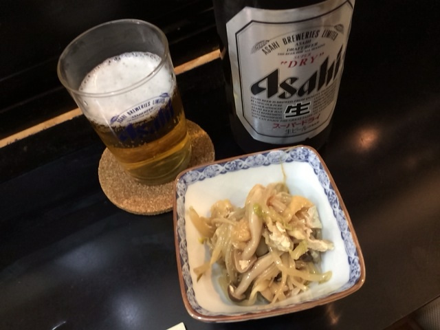 とりあえずのビール&お通し。続いて刺身三点盛。少しづつ三種類を食べられるのがいいです。