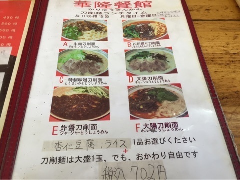 こちらの中より選んだのは…四川担々刀削麺 702円。