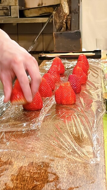 デザートには特大イチゴをその場でいちご大福にしちゃうパフォーマンス。