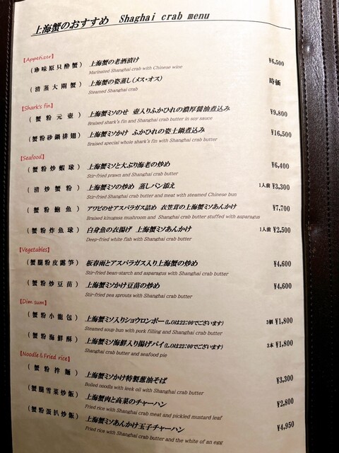 『上海蟹の姿蒸し(オス・メス/時価)』