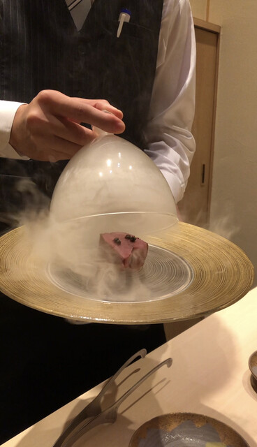 もわーっとモクモクの煙の後に登場したのは桜チップで瞬間燻製したシャトーブリアンです。あぁなんか神々しいね。肉の表面だけに瞬間的に火を入れて瞬間燻製を施しているんだって。粒胡椒と一緒に頂きました。本当に美味しかった。