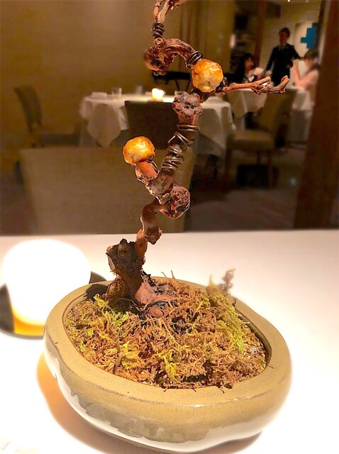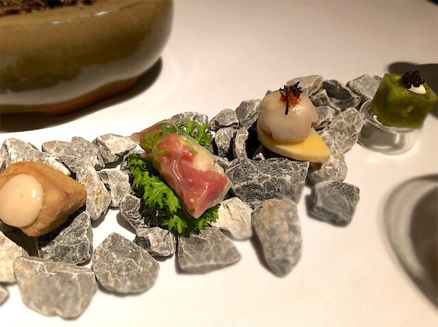 テーブルクロス上にの小石が並べられ、物語が始まるのです。石の上には、アミューズが4品。『ミニカツレツ』『鮪の生春巻き』『筍のマリネの・フグ』『フグ・菜の花・キャビアのジュレ』。そして、ぶどうの木にに見立てた盆栽には『オニオン・アンチョビパイ』がなってます。それを手で積んで食べるスタイル。