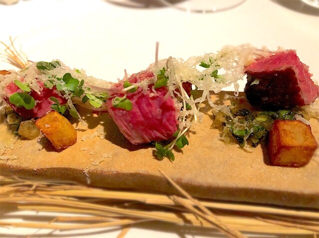 シェフのホームタウンの能登の牛の藁焼き。この牛肉の火入れがまた完璧でお見事。超絶美味しかった一皿。上には海老と旨みのギュッと詰まったコンテチーズが乗せられており。絶妙。