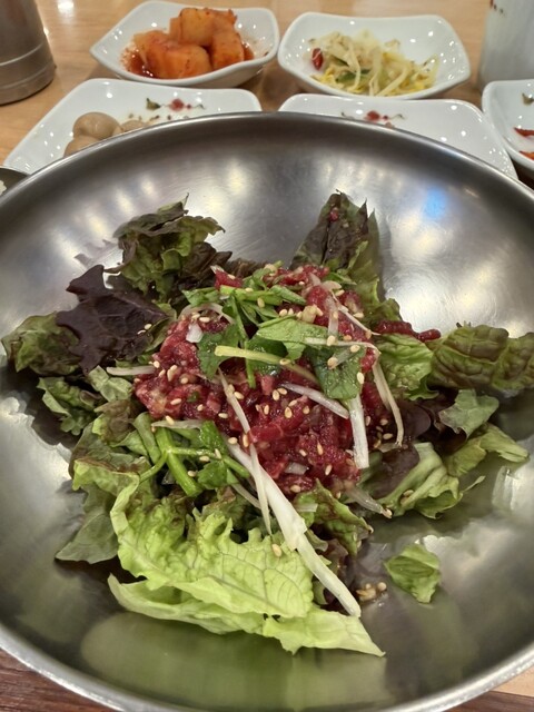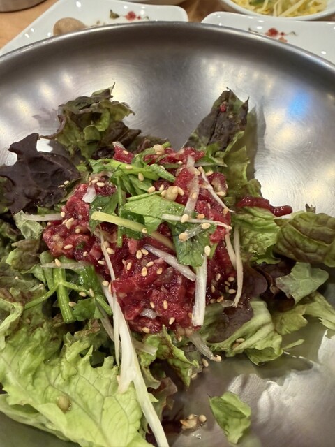 最近のユッケビビンパはナムルじゃなくて生野菜とかミナリとあえるものが主流ですね。こっちの方がさっぱりで好き!!