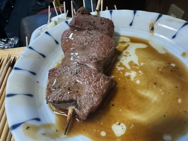 さて、まずはレモンサワーどうやらコースのようなので、まずは塩で様子を見る。野菜が五種類(プチトマトにピーマンにネギにタマネギ&ウインナーにキノコ)あとは8種類で1コースであった。長年の夢であったのでこのまま帰るに忍びず、ハイボールを追加して、野菜除いてタレでお願いしてみる。さらにレバーをタレと塩、ネギとキノコで22本でフィニッシュ。