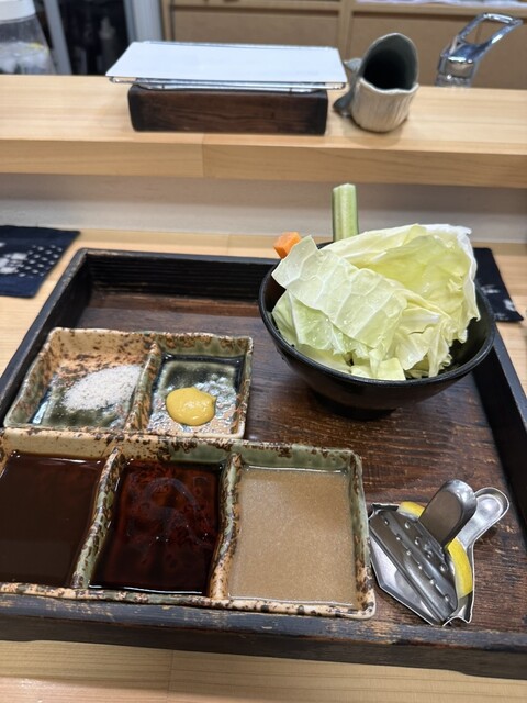 テーブル上には前の店舗と同じく、親方が修行された大阪の老舗と同じスタイルで、木製のお膳に三連のソース入れ、二連で塩とカラシが入るのが左手前に置いてある。右奥にはおつまみキャベツ、右手前にはレモン絞りが置いてあり、グラスにキウリとニンジンの野菜スティックをセットされているのはいつもどおり。少し上がった上段には串揚げを置けるのが置いてあり、隣は今までのお魚ではなく、新しく作られたという鯨が口を開けた形の串入れが置かれている。