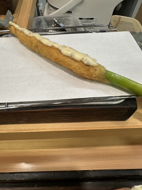 さて、おめでとうございますのご挨拶して着席して間も無く串揚げがやってくる。手でそのまま持っていただくアスパラの肉巻きからのスタートは今までどおり。いくつかの新メニューは若旦那の創作か。前のお店から持ってきていただいていた焼酎をお湯割りでいただきながらいつものようにテンポよく、親方の作品と若旦那の作品をいただいてゆく。最後はデザートのアイスクリームとお茶でフィニッシュ。