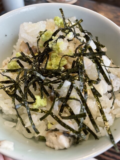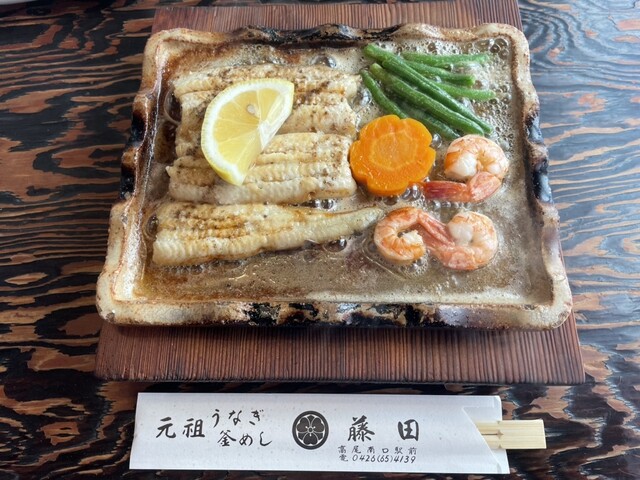 まずはバター焼きから登場。プレートから湯気がもうもう、乗せてあるレモンを絞るとそれが跳ね返ってアツいのなんの。ホクホクの間に食すべしということか。ホロホロ溢れてしまいそうなので少しずつ食べ進んで、食べ終わってからは身が少し残っている皮のみを食べるとこれまたサクサク。ニンジンとインゲンとエビを均等に割り振りながら完食すると間も無くうな釜の白が登場、いろいろと御指南が書かれているそのとおりに食べ進む。ひつまぶし高尾版といったところか。ワサビが効いて、さらに二杯目に山葵塩をかけたのは秀逸だ。