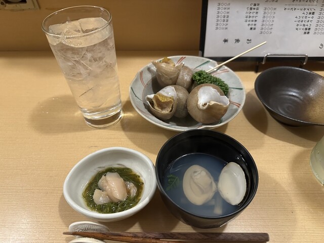 予約していた9組には大将が断りの電話を入れてしまい、バイトの女の子たちも来ていないので、暖簾を出さずに細々営業に突入。こんな時こそ少し貢献しなきゃとボトルを一本入れて、白バイ貝に生牡蠣に板谷貝のガーリックバターを出してもらい、その後家探しにやってきた外国人お一人がお勘定した後はとうとう飲み会に突入。白バイ貝をお代わりして、貝めしをお土産にして僅かなお金をお店に落として退店。