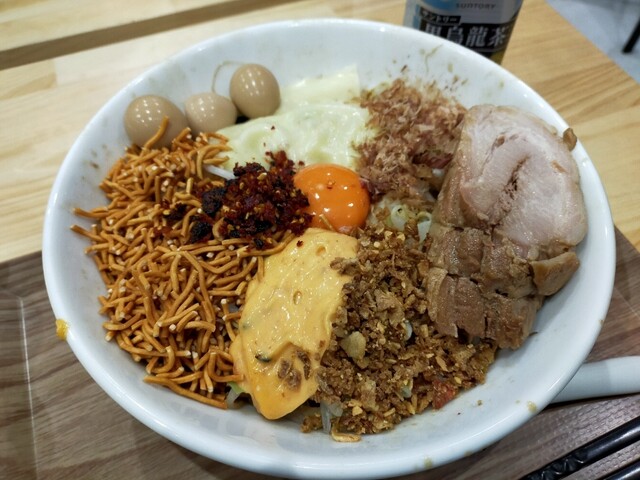 もはや説明不要。大きくカットされたブタ様はホロホロで、噛めば旨味がジュワ〜って拡がる。美味い!やや硬めの太麺がエビマヨとタレに絡んで美味いのなんのって。ベビースターのポリポリ食感もジャンクメシには大事なポイントよ。そんなこんなで食の八合目辺りまでは駆け上って行ったんですが……