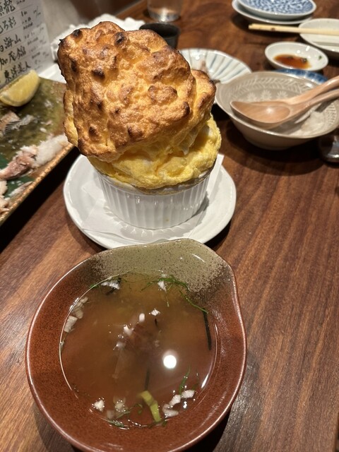 名物のスフレ状の卵焼きは出汁を付けて食べる明石焼きスタイル。
