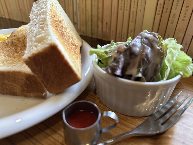 モーニングサービスとは思えない厚切りパン、サラダにスクランブルエッグ
