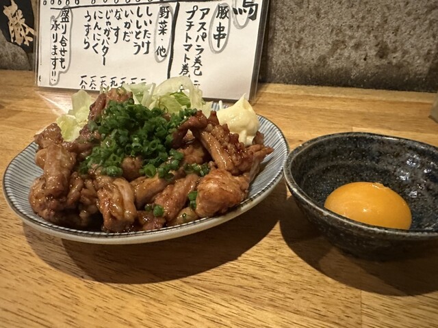 せせりのタレ炒めはお好みで卵の黄身をつけて