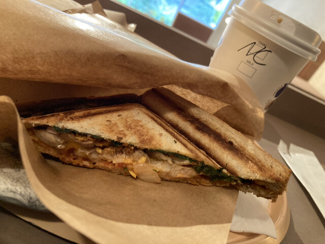 オーダー時に“別なホットサンドを頼んで半分こしよ。“とこちらが話したのを聴こえてたのか、それぞれの皿にふたつの種類のホットサンドが半分に切ってそれぞれを包み紙で包んで提供して頂きました。気の利いた心遣いに感謝です。