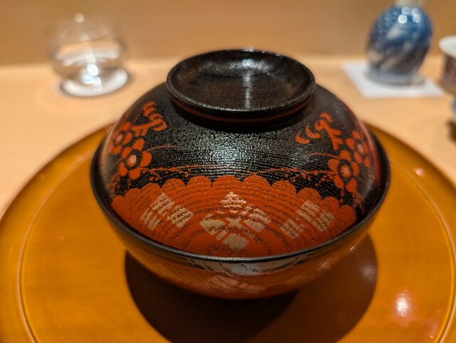 その注文のコース、お料理の一つひとつが繊細かつ格別な味わいであることはもちろん、その華やかさはテーブルを鮮やかに彩ります。今回は1月ということもあり、季節感溢れる「おせち」の趣を随所に散りばめた、日本料理を心ゆくまで堪能いたしました。その素晴らしいお料理の中でも、色鮮やかな「八寸」、出汁の旨みが素晴らしい「すっぽん出汁のお椀」、上品な味わいの「カラスミ餅」が特に印象に残ったお料理でした。