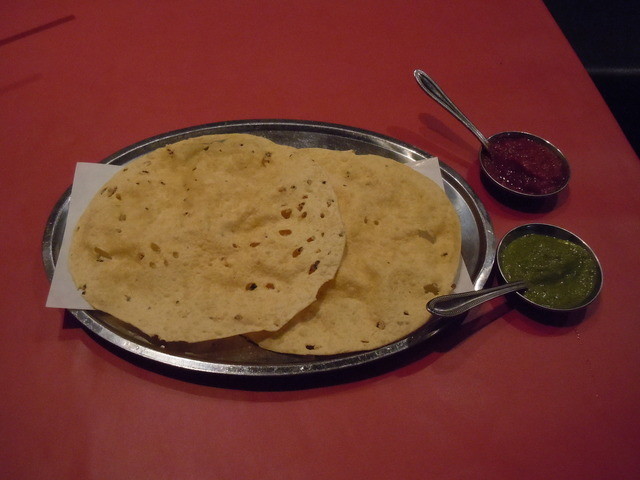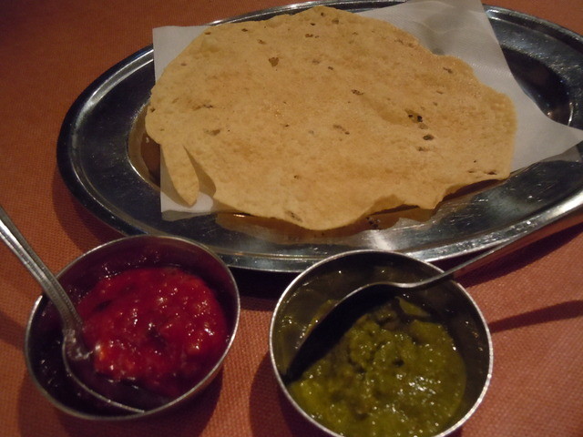 パパード、これはパリパリのレンズ豆の煎餅ですが、赤のソースと緑の辛いソースがついてきました。緑を少しと赤を多めにつけて食べるとちょうどよかったです。