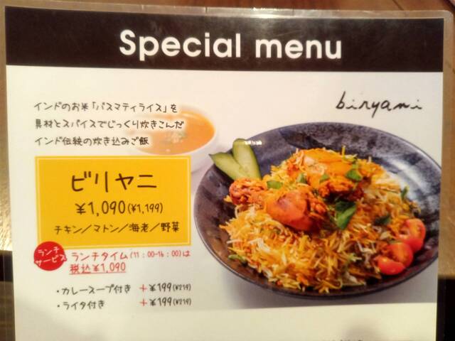 ビリヤニ(1090円)、カレースープ付き(+199円)、ライタ付き(+199円)