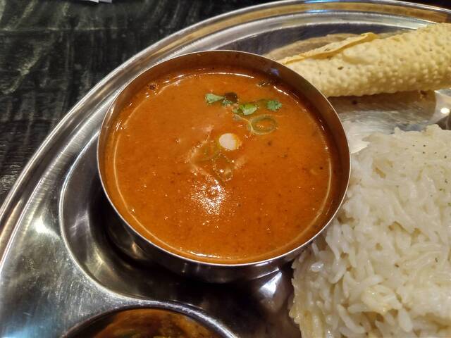 チキンティッカと野菜が入った、トマトベースの少しスパイシーなカレーとのことですが、