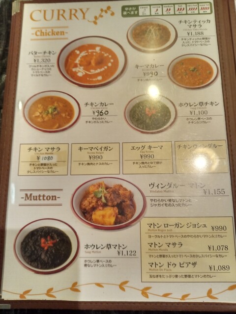 チキン、マトン、海老、野菜の中から、私がマトン、妻はチキンをチョイス。