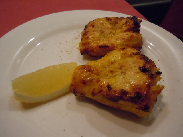 続いて一品をチキンティッカ・シシカバブ・サモサの中から選びます。チキンティッカを注文したところ、炭火で香ばしく焼いたカレー味の鶏肉でした。