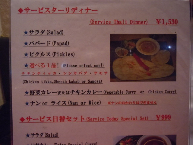 サービスターリディナーの内容は、サラダ、パパード、ピクルス、シシカバブ、野菜カレーまたはチキンカレー、ナンまたはライス、です。「シシカバブは羊肉ですよ」と店員さんがおっしゃてくれました。
