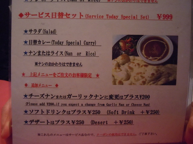 サービス日替わりセットの内容は、サラダ、日替わりカレー、ナンまたはライスとなっていて、