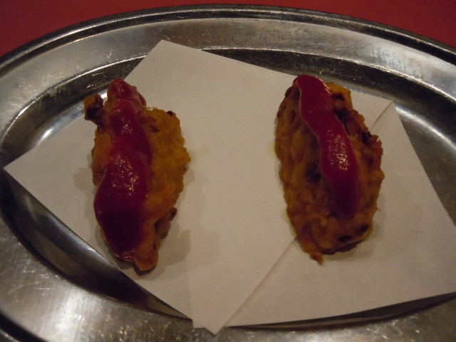 赤い甘辛ソース・緑の辛めソースをつけて食します。