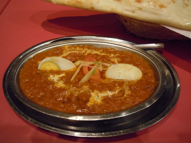 マトンマサラカレーは銀色の器に入ってきました。この器はインド料理の定番ですね。上にゆで卵とトマトやネギが乗っています。スパイスが効いて玉ねぎがシャリッと歯ごたえがありトマトの甘みがスパイスにマッチしていてプレーンナンとの相性バッチリ。ナンのほんのりした甘さにトマトと玉ねぎの甘さが効いたルーが合います。