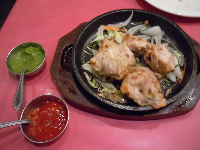 チキンが鉄板皿に盛られてジュージューしてやってきた。レモンを振りかけ赤い甘辛ソース・緑の辛めソースをつけて食します。ヨーグルトや生クリームに漬け込んだチキンとのことですが、実に美味しい、そして柔らかい。どうしたらこんなに柔らかくなるのか。頼んでよかった一品でした。