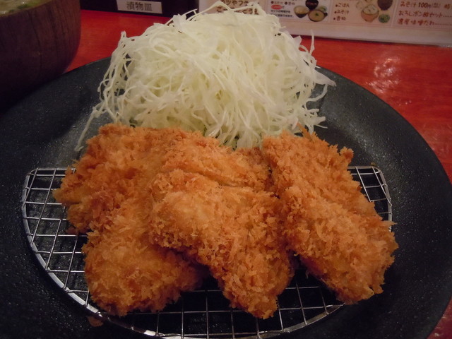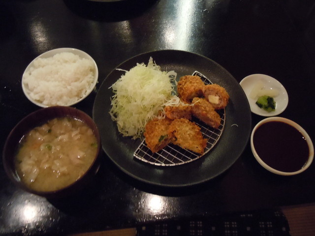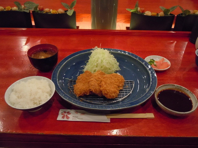 今回は牡蠣フライ&ヒレかつ(1080円)を注文。そして前回もらっていた豚汁無料サービス券を使いました。いつものようにごはんセットを注文したら店員さんが「それでしたらごはん単品(150円)を注文した方がお得ですよ」とアドバイスしてくれました。いつもながら親切で感じがいいです。牡蠣はじっくり揚げるので少々お時間がかかりますこと。