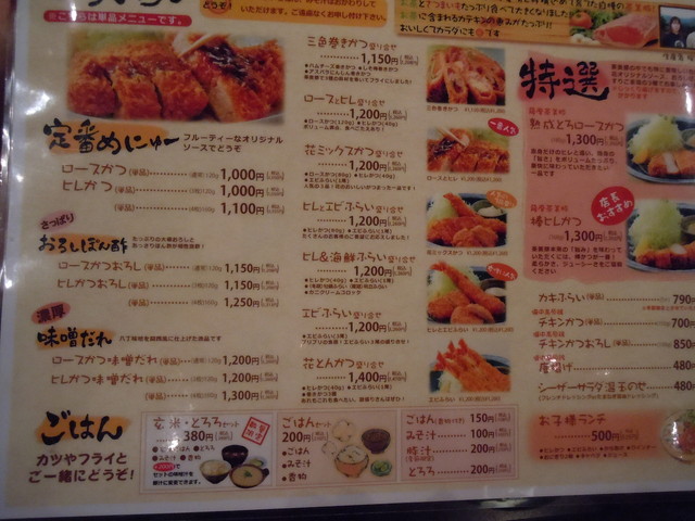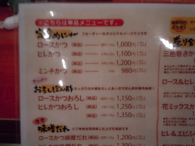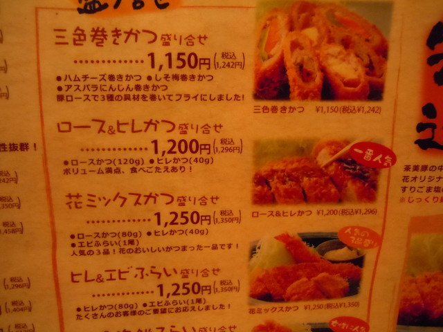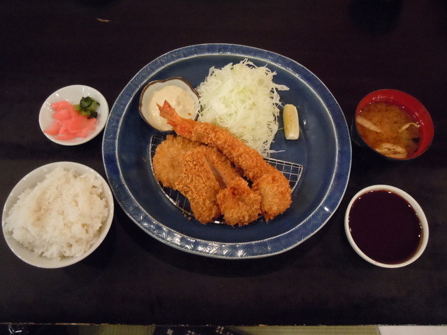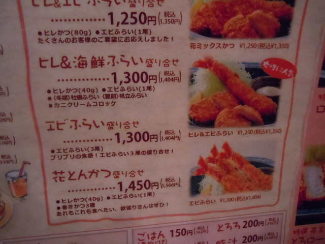 今回は私がヒレ&海鮮ふらい盛り合せ(1250円)、妻が三色巻きカツ盛り合せ(1150円)、こはんセット(210円)を注文。