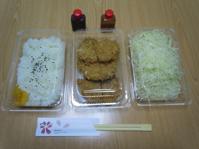 今回は持ち帰りのヒレカツ弁当(800円)を利用しました。注文してから揚げるので10分ほど待ちます。ドレッシングは玉ねぎと青じそを選べます。玉ねぎを注文しました。