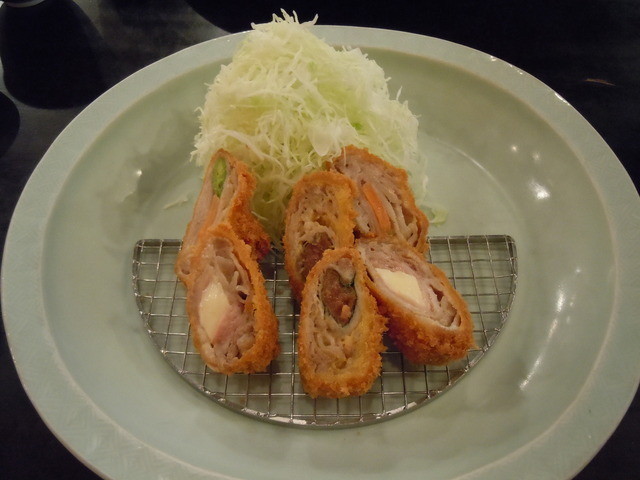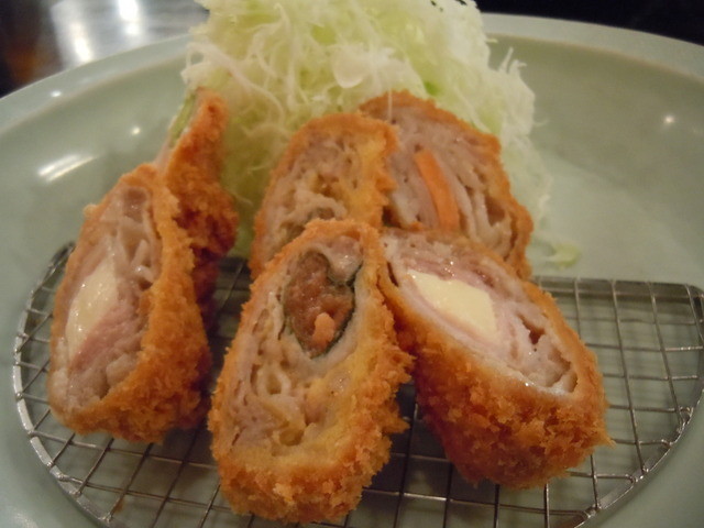 三色巻きカツ盛り合せは、ハムチーズ巻きかつ、しそ梅巻きかつ、アスパラにんじん巻きかつが2つずつ。それぞれ茶美豚の薄切りで具材を巻いて揚げていました。