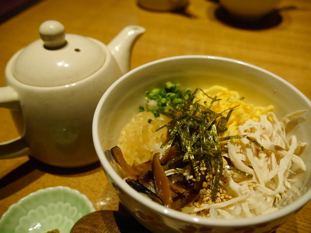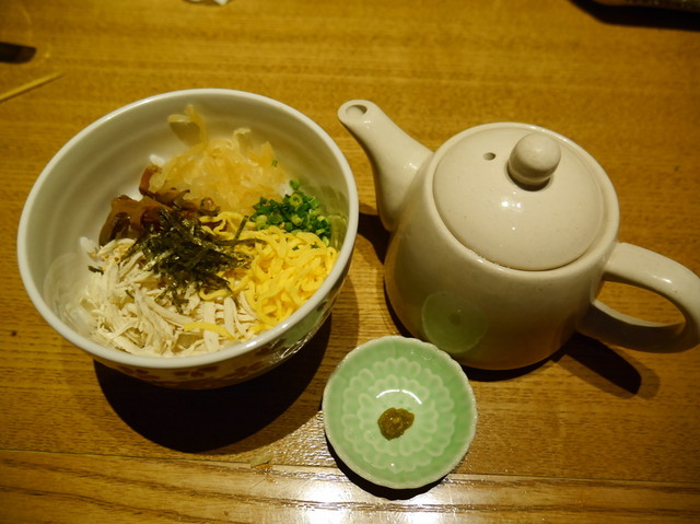 出汁が美味しくて、鶏の繊維質が柔らかいごはんと一緒に食べると、鶏茶漬け。