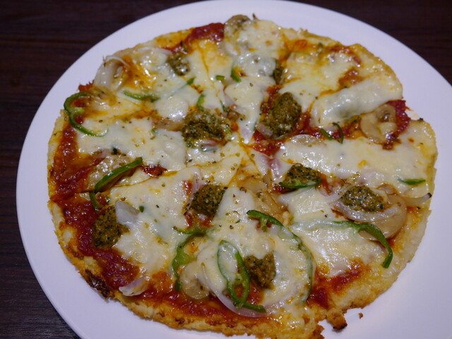 香辛料を入れたひき肉がちょこちょこ乗ったピザです。
