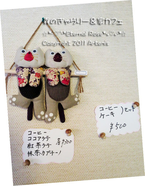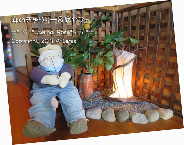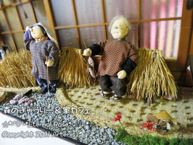 2012年11月8日にオープンした、未だあまり知られていない隠れ家のような、でも、とってもメルヘンを感じる素敵なカフェ、森のぎゃらりー&家カフェに行ってきました。駐車場は、月曜日、金曜日は、お店の入り口である、奥の緑の暖簾の隣の2台だけですが、土曜日、日曜日は、駐車場のどこに置いてもOKです。昔、玉野市営電気鉄道の線路が通っていた所が道になった道の側にあります。今日、調べてみると、1年ちょっと前にネットで、ちょっと気になるお店として見た事があるお店だった事がわかりました。女性オーナーが、テレビ番組の「人生の楽園」を長年ご覧になっていて、いつか田舎で第二の人生を送りたい。と思われて、お母さんのご実家をコンバージョンして、カフェを始められました。玄関の水盤が素敵です。玄関を入ると、柿木の側で釣りをしている、おじいさんに出迎えられました。話が弾んで、色々お話をしましたが、女性オーナーは、勝山にも築100年の古民家を購入されていて、いつか、そちらもお店をしたいと思われています。釣りをしている、おじいさんの隣にある照明は、その勝山にある、あかりギャラリーKEN工房の町並店で購入された、素敵な照明です。(KEN工房は、どちらも行った事がありますが、その時のお話は、またいつか……いつになるんだろう…(;^_^Aアセアセ・・・)一歩部屋に入りますと、お部屋いっぱいに、かわいくて、素敵なお人形や、和雑貨が展示販売されていて、その圧倒的な数に目を奪われます。こちらの部屋は、主に作家さんの作品の展示委託販売です。人数が多い場合は、この部屋の奥のテーブルと、椅子をカフェルームに運んで2席になります。オーナーと、オーナーのご主人、オーナーの師匠ご夫婦の作品のお人形が、とってもかわいいんです。購入されたミニチュアもありますが、小物は手作りなんですよ。カフェルームのテーブルは、通常この囲炉裏のテーブル4席のみです。キウィと、りんごの箸置き。こちらの座敷の座卓で人形制作をされています。人数が多い場合は、この座卓もカフェの6席になります。左にさつまいもの鉢があり、女の子は焼き芋を食べてますw撮影が下手で、写っていませんが、奥の男の子は、寝そべって本を読んでます。和柄の布は、お値段が高くて、なかなか無いので、大変なんだそうです。端切れでも捨てずにひざ当ての布に使ったりするそうです。フリーマーケットで見つけられたという、わさび粉の缶が、私のツボでしたw天日干しのお米って、最近入手が難しいですよね~。このさつまいもに、テンションが上りました!そっくりな色の布を使って、本物のさつまいものツルですよ。ご主人が作られるミニチュアには、ため息が出ます。お人形に添えられる小物が、良い仕事をするので、とても重要なんだそうですが、作成には手間隙がかかっています。メニューは、壁に貼ってある、ドリンクとケーキセットのみです。ケーキは手作りで、本日のケーキは、抹茶ロールと、バニラロールでした。紅茶ラテと、バニラロールケーキのセット500円にしました。囲炉裏は、ちゃんと使える物ですが、ディスプレイになっていて使用されていませんが、雰囲気がありますよね~。バニラロールの上に栗がトッピングされていて、うれしいサプライズですね。ロールケーキは、程よいやさしい甘さで、ふんわりとしていて、紅茶ラテは、やや甘めでどちらも美味しかったです。つづく…この口コミについての詳しいブログ ブログには食べログにUPしていない写真を掲載しています。Eternal Rose (エターナル ローズ)http://blog.livedoor.jp/x_eternal_rose_x/archives/1010830505.html
