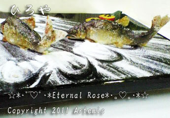 漆塗りの板状の器に、塩で川の流れを描いて、鮎がまるで泳いでいるような、