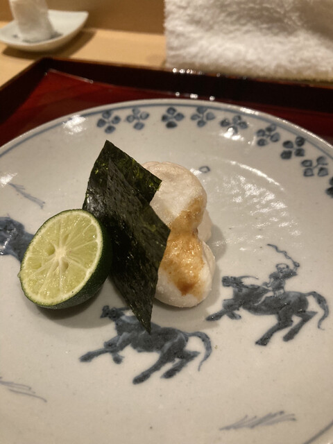 お料理を3種選んで追加することができたので、飛騨牛も気になったのですが、河豚白子を頂きました。表面に焼き目がついており、海苔と一緒にスプーンにのせてそこにスダチを絞って頂きます。言うに及びませんが絶品でした。