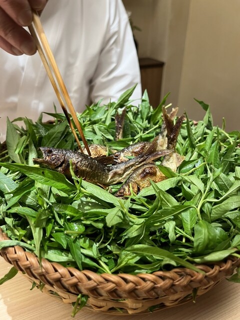 また、天然鮎の炭火焼も非常に記憶に残るものでした。緑を敷き詰めた籠の中に鮎が入って提供されるのですがこのプレゼンが印象に残るし、写真を撮っても動画を撮っても非常に映えると思います。籠がやってくるとまず炭の匂いがふわりと香ってきて、食欲を引き立てる。これにはビールがとても合うからと、ふたくち分くらいの可愛らしいグラスにビールを入れて一緒に提供してくれます。当然ですが最高の鮎との組み合わせです。カリッとした食感と、炭火焼の香り、鮎の持つほろ苦さなどが相まってこの上なく贅沢な大人の夏の味という感じでした。そして口内に残った味をビールで洗い流すのがとても贅沢な瞬間でした。