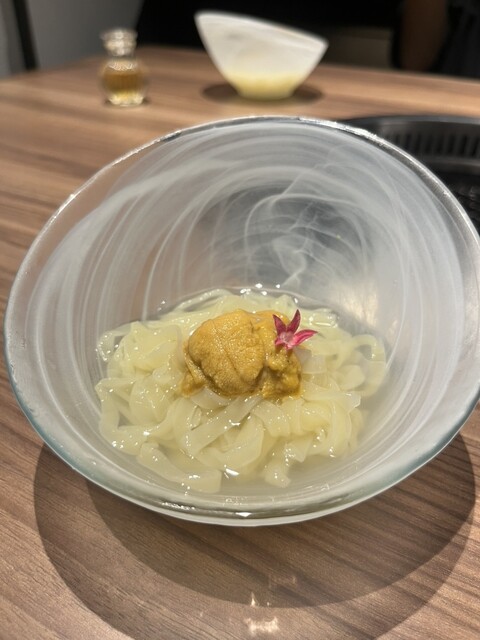 中盤の「ひとくち雲丹冷麺」は、名前に反して嬉しいしっかりめの分量。雲丹の質も良く、特注の平打ち麺に冷たい出汁が涼やかにのる。焼きの合間に口を洗い、また次の肉へと気持ちを切り替えてくれる、とても良い配置です。