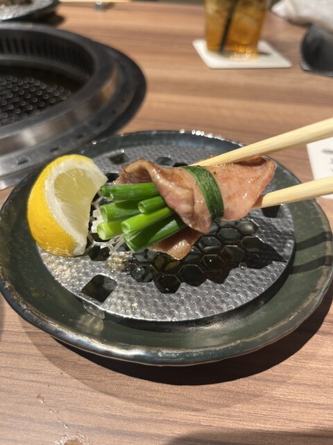 焼きものは「極上タン2種」から。薄切りは紫蘇とポン酢ジュレで清涼感すら感じさせる仕上がり。ネギ巻きタンは一口サイズながらジュワッと肉汁が立ち上る。テクスチャのコントラストと薬味の使い分けで、タンの表情がここまで変わるのかと感心します。