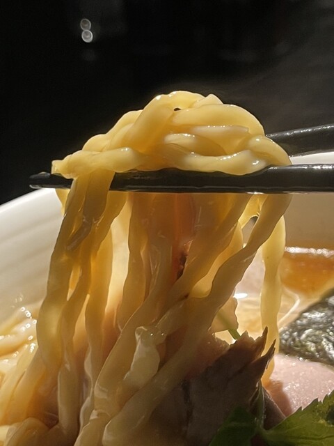 麺は手揉み平打ちでツルモチ食感でスープと良く絡んでいます。